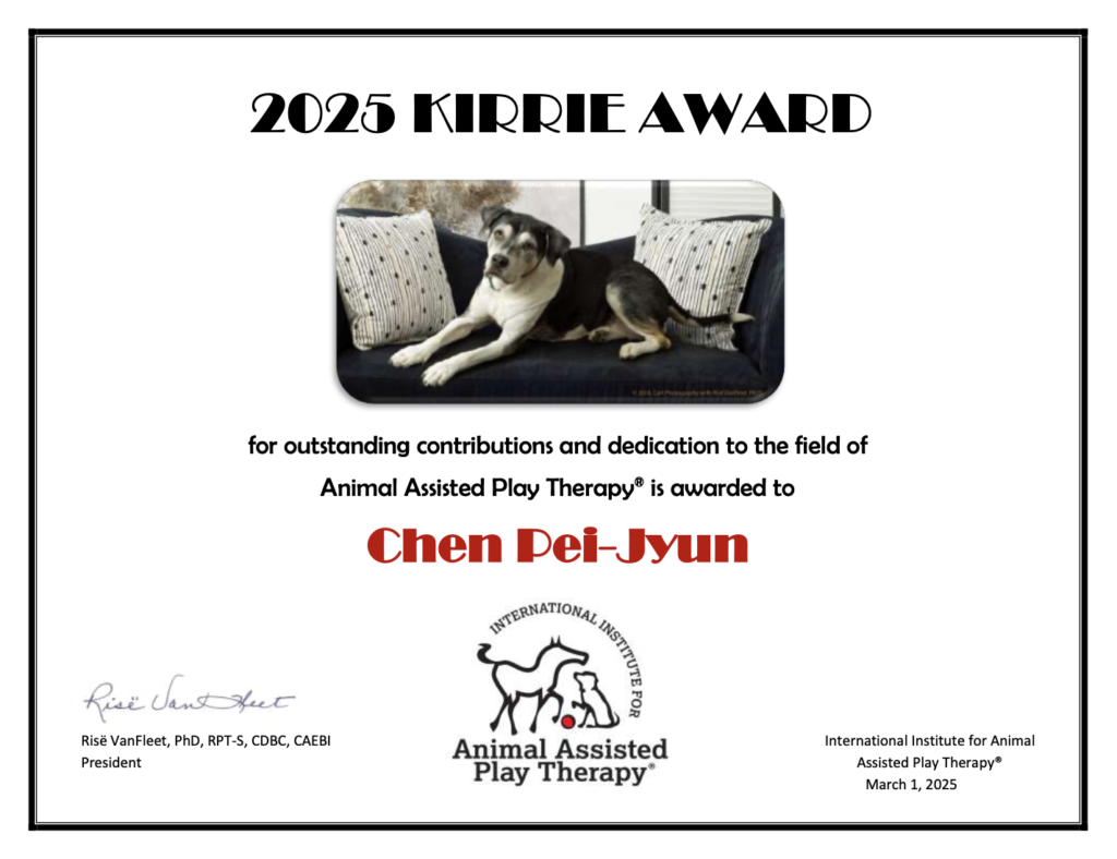 (翻譯:Kirrie 獎由國際動物輔助遊戲治療協會®頒發,旨在表彰「在動物輔助遊戲治療領域的傑出貢獻和奉獻」。)