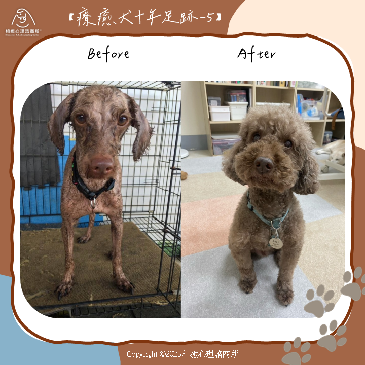 那時大概五歲的Mocha,在我們沒有參與到的那段日子裡,即使有過那樣的際遇,但對人的信任始終沒變,看到任何人都想撒嬌和抱抱,也因此通過我們的評選,成為我們的第四隻療癒犬。很多人說Mocha是很冷靜的狗勾,不太會隨意撲跳、吠叫,顛覆你對貴賓犬的想像。他也是最全方位的療癒犬,個案工作、團體工作、演講和營隊樣樣行,服務族群也從3歲以下的極早療到85歲以上的長輩都能勝任。