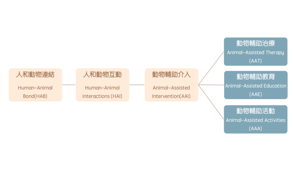 根據國外兩大具公信力之動物輔助介入相關組織-Pet partners及International Association of Human-Animal Interaction Organizations(IAHAIO)的定義,動物輔助介入(Animal-Assisted Intervention, 簡稱AAI)是一種以目標為導向的結構性介入,旨在有意圖地(Intentionality)將治療性動物納入各類人類服務中,以達到改善人類身心狀態、生活品質之目的。依據執行人員之專業領域不同,及介入的目標與型態更細分為動物輔助治療/諮商(Animal-Assisted Therapy/Counseling, AAT/AAT-C)、動物輔助教育(Animal-Assisted Education, 簡稱AAE)與動物輔助活動(Animal-Assisted Activities , 簡稱AAA)。目前已應用於心理、社會、教育、職能、物理、語言、護理、健康……等不同專業領域。而所有提供AAI的專業人員,皆須充分了解動物的行為、需求、健康以及對壓力的調節,以維護服務對象和治療性動物(Therapy Animal)之福利。